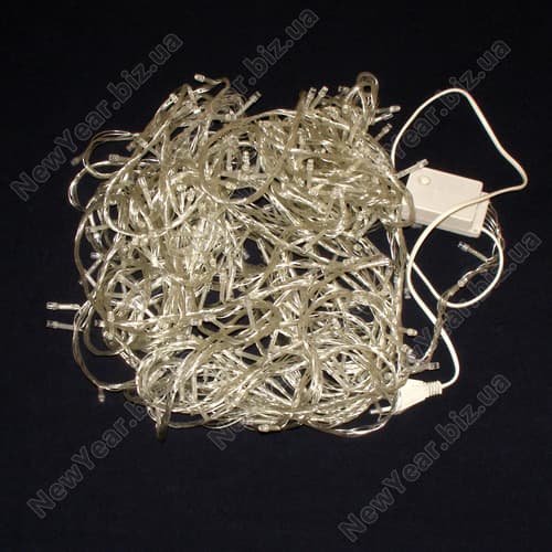 Новогодняя светодиодная гирлянда с белым (частично прозрачным) проводом и белым свечением.