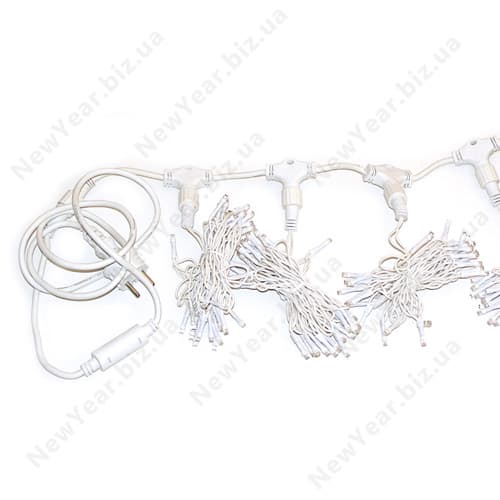 Влагоустойчивая светодиодная гирлянда с белым проводом и белым свечением для украшения деревьев, фасадов домов и помещений с высокой влажностью. Выглядит как один провод длиной 3 метра со свисающими ответвлениями длиной 2 метра. Каждое ответвление можно при желании отделить, они крепятся через разъем.