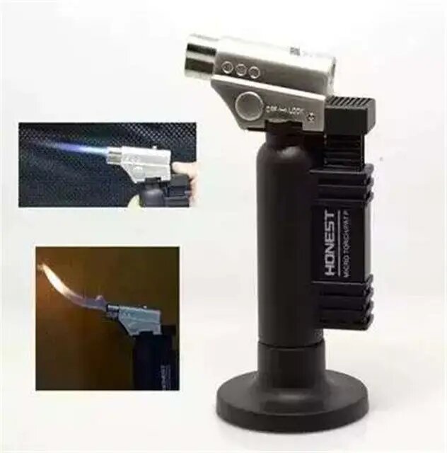 Легкая и удобная портативная горелка с заправкой от обычного бытового газового баллона для зажигалок.