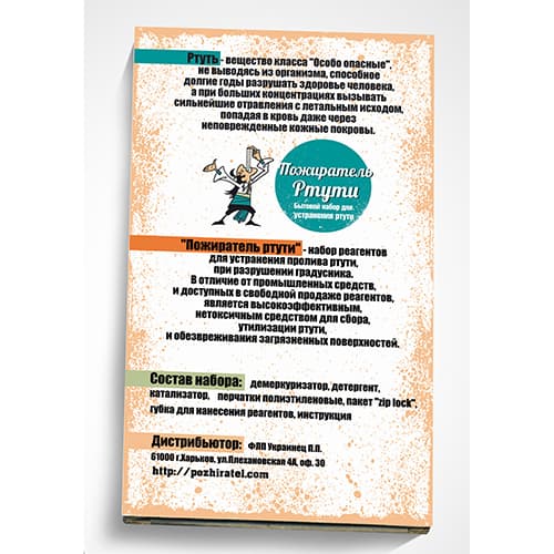 2. Реагент для очистки поверхности, контактировавшей с ртутью. Наносится на полы, мебель и прочие предметы. Щадящий состав. Нанесённый на поверхность состав реагирует с молекулами ртути на протяжении 6 часов. А при низких температурах 12 часов. Объем - 50 мл.