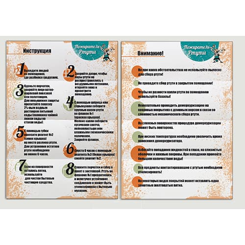 Жидкую ртуть подручными средствами собрать во флакон №1. Ртуть руками трогать нельзя! С помощью губки нанести жидкость из флакона №2 на все поверхности, куда попали капли ртути. Если для сбора ртути использовались какие-либо инструменты, то нанести жидкость на них. Оставить на 6-12 часов. Промыть поверхности и инструмент при помощи жидкости из флакона №3. Можно также использовать бытовые моющие средства. Губку и перчатки поместить в пакет Zip-lock и утилизировать с бытовым мусором.
