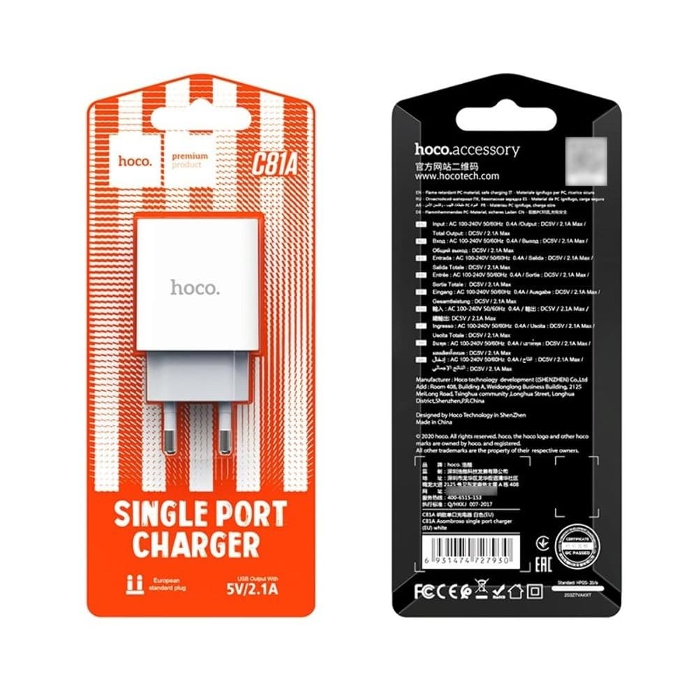 Купить Сетевое зарядное устройство Hoco C81A, 1 USB, 2.1 А, белое можно и в нашем офисе, платить за доставку при этом не нужно.