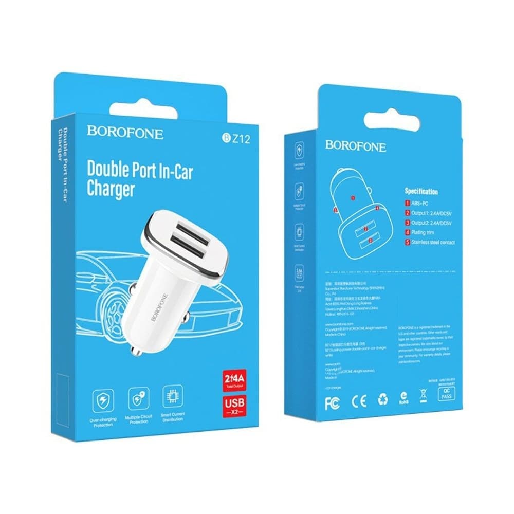 Автомобильний зарядний пристрій Borofone BZ12, 2 USB, 2.4 А, белое | зарядка, зарядное устройство