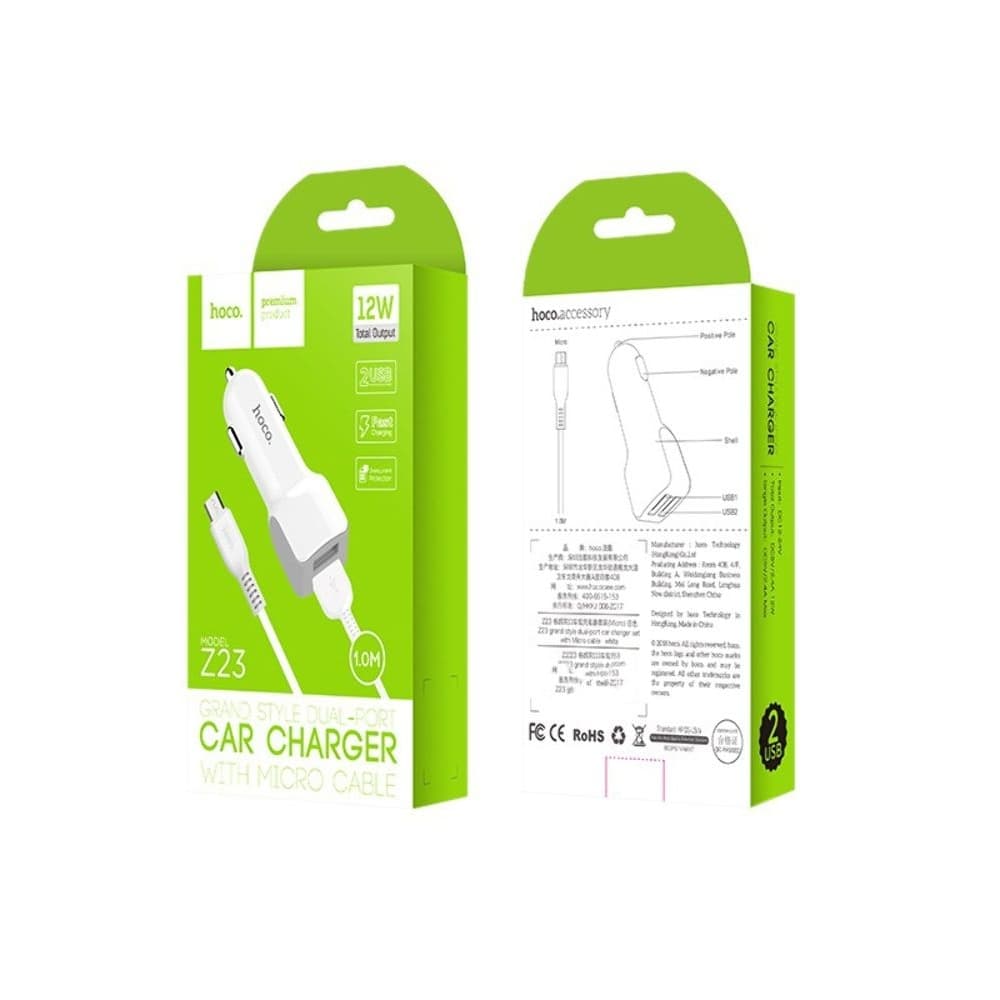 Автомобильний зарядний пристрій Hoco Z23, 2 USB, 2.4 А, Micro-USB, белое | зарядка, зарядное устройство