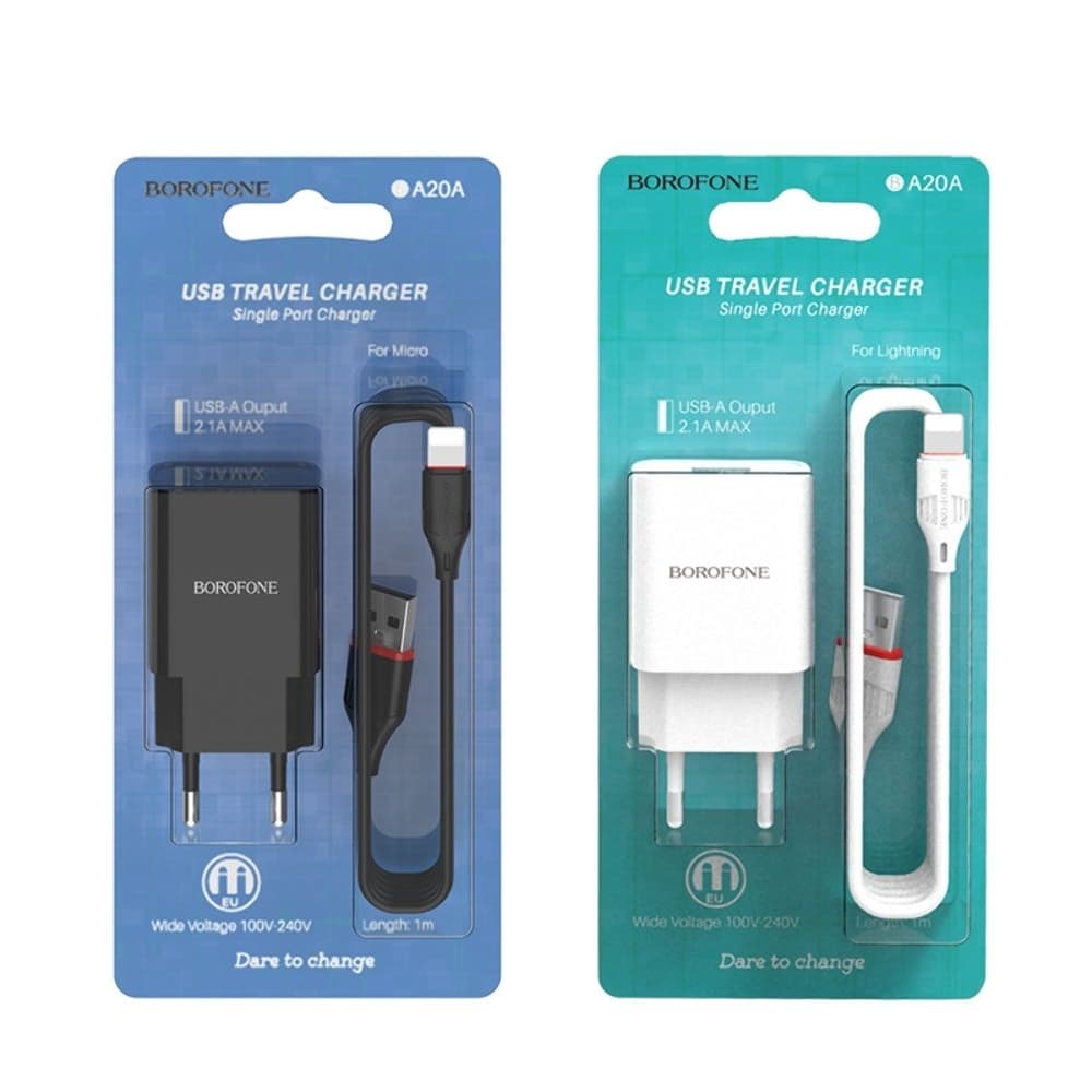 Сетевое зарядное устройство Borofone BA20A, 1 USB, 2.1 А, с кабелем Lightning, черное