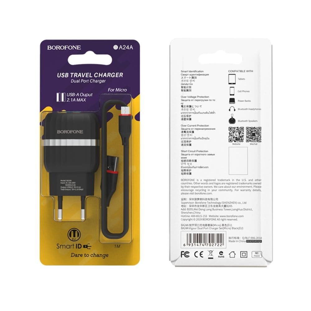 Купить Сетевое зарядное устройство Borofone BA24A, 2 USB, 2.4 А, Micro-USB, черное можно и в нашем офисе, платить за доставку при этом не нужно.