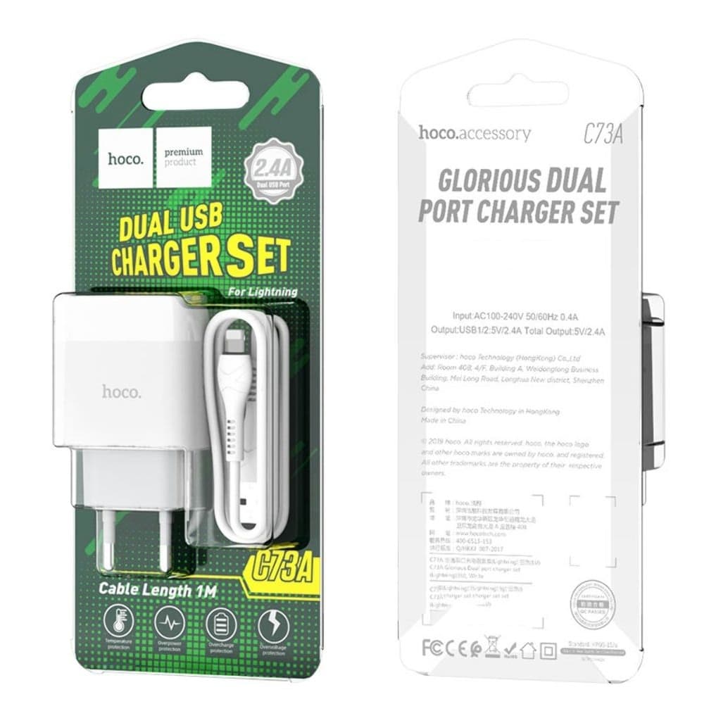 Купить Сетевое зарядное устройство Hoco C73A, 2 USB, 2.4 А, Lightning, белое можно и в нашем офисе, платить за доставку при этом не нужно.