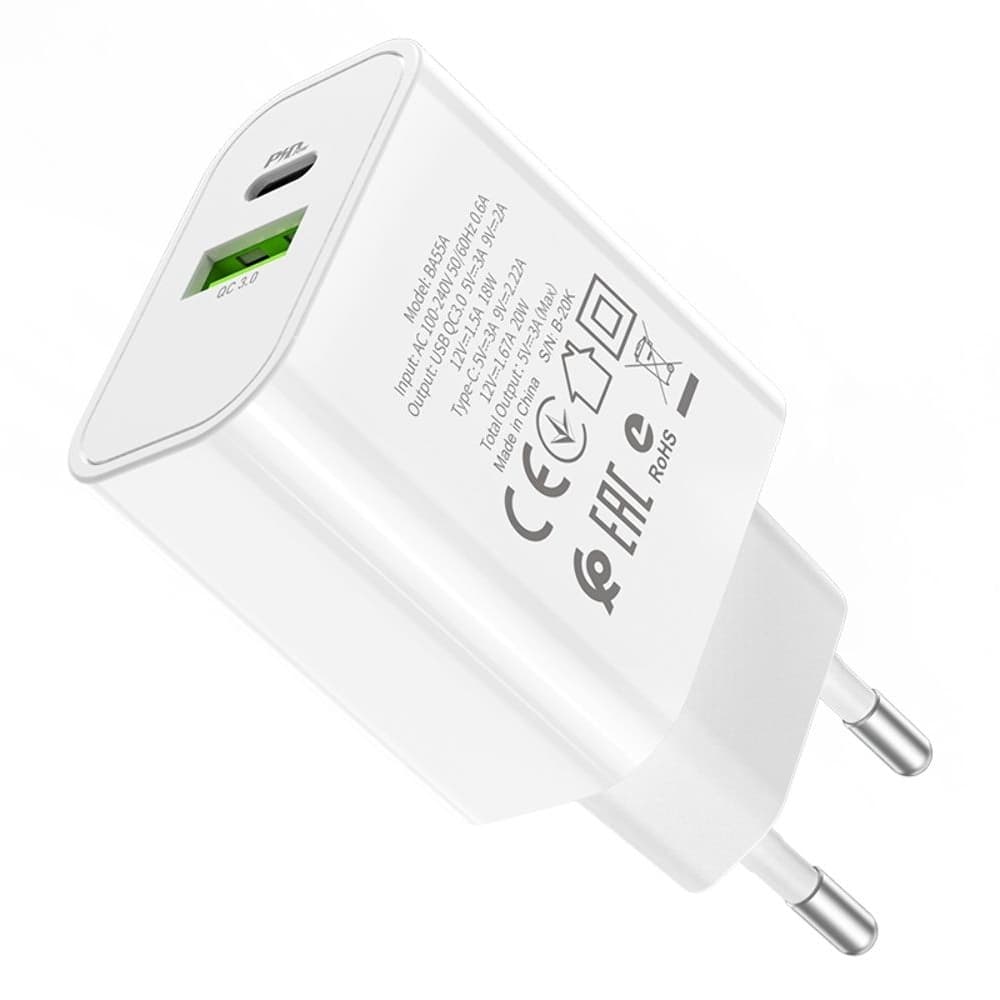Сетевое зарядное устройство Borofone BA55A, Power Delivery, Quick Charge 3.0, 20 Вт, белое