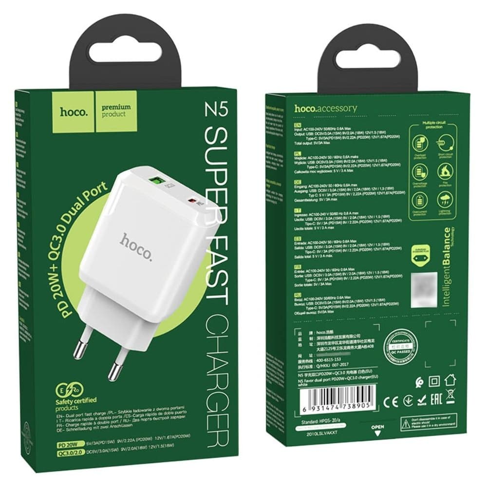 Сетевое зарядное устройство Hoco N5, 1 USB, 1 USB Type-C, Power Delivery, Quick Charge 3.0, 3.0 А, белое