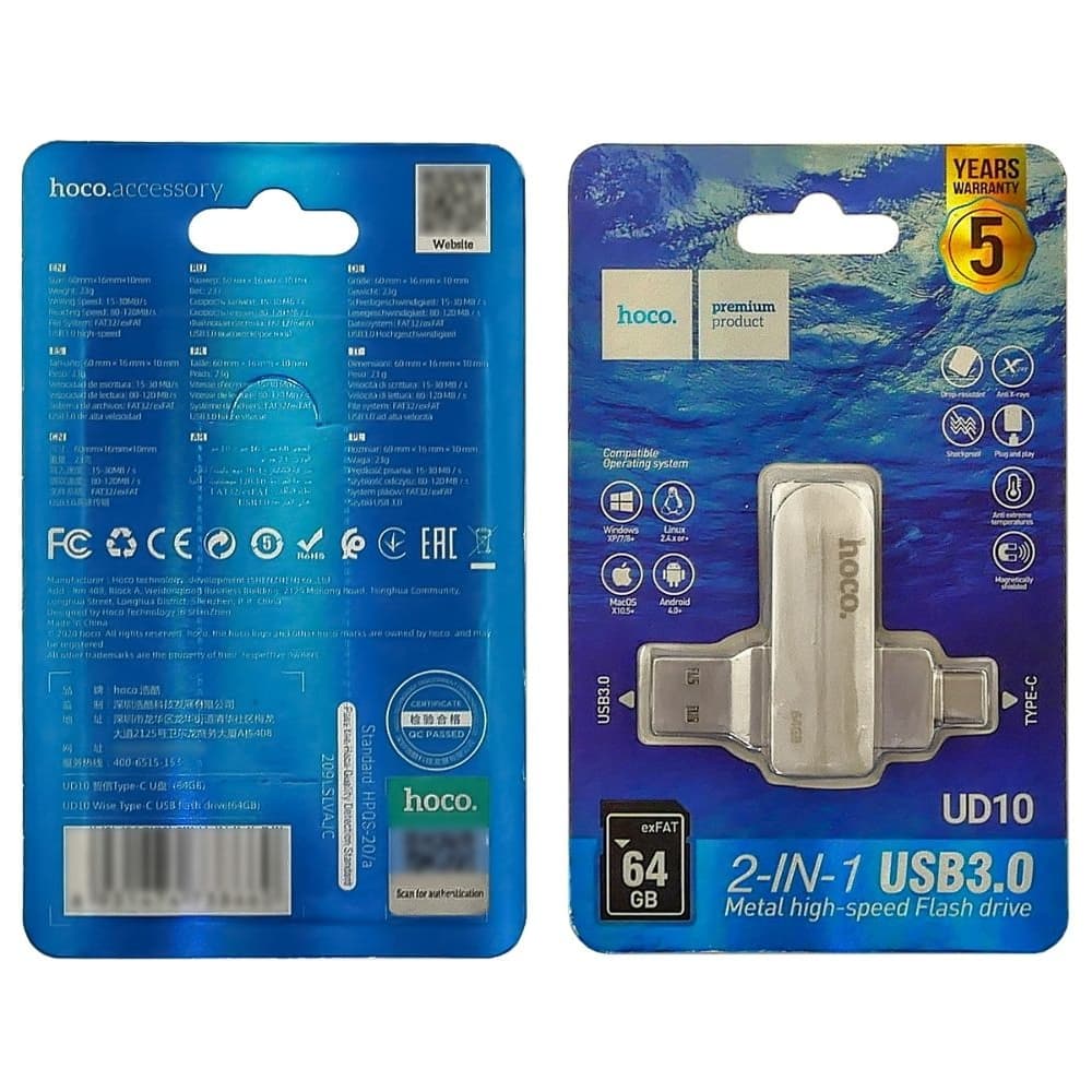 Купить USB-накопитель Hoco UD10, 64 GB, Type-C, USB 3.0, 2 в 1, серебристый можно и в нашем офисе, платить за доставку при этом не нужно.