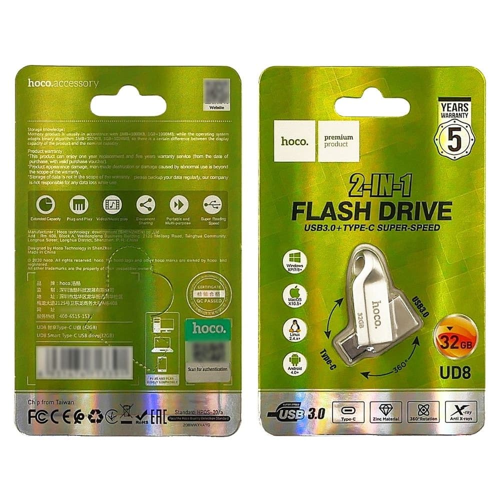 Купить USB-накопитель Hoco UD8, 32GB, Type-C, USB 3.0, 2 в 1, серебристый можно и в нашем офисе, платить за доставку при этом не нужно.