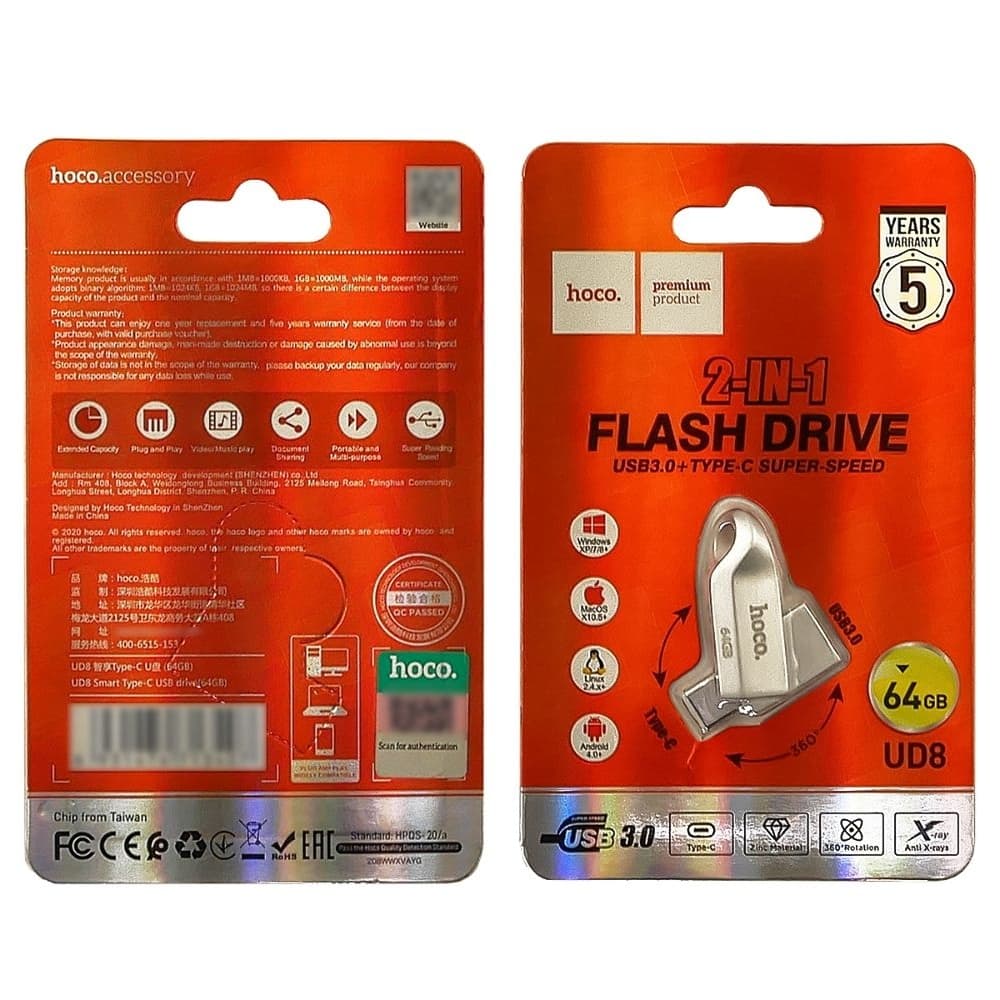 Купить USB-накопитель Hoco UD8 64GB Smart Type-C 3.0, серебристый можно и в нашем офисе, платить за доставку при этом не нужно.