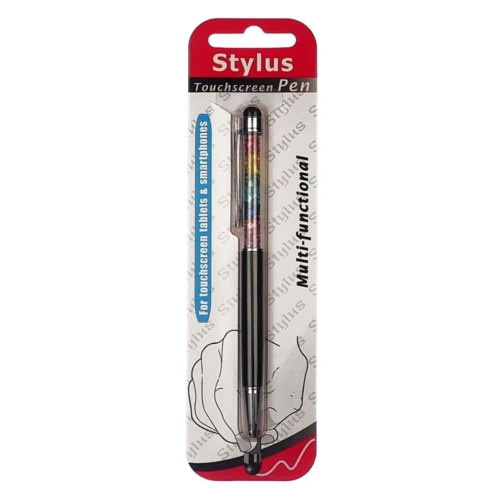 Стилус емкостный, с шариковой ручкой, металлический, чорний, с кристаллами цветов радуги