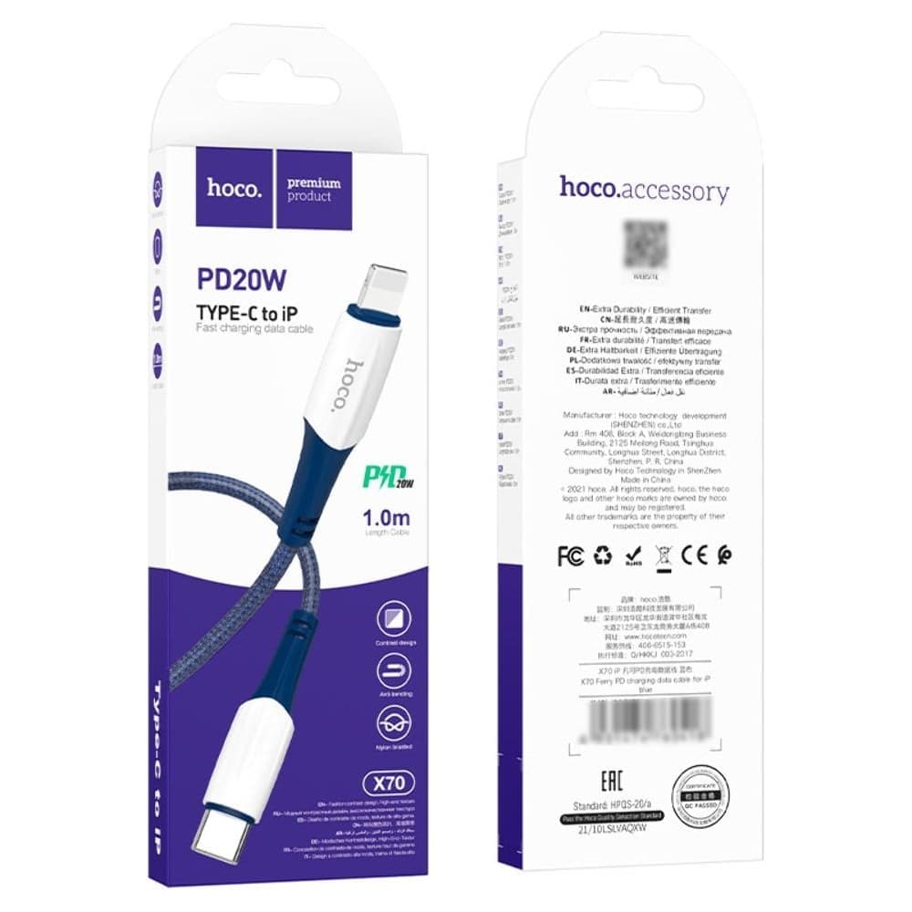 USB-кабель Hoco X70, Type-C на Lightning, 100 см, Power Delivery (20 Вт), синій