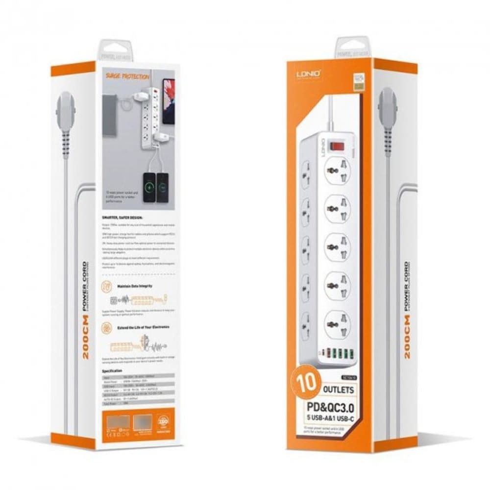 Сетевой удлинитель Ldnio SC10610EU, 10 розеток, 5 USB, 1 USB-C, 5V, 10A, 18 Вт, кабель 2м