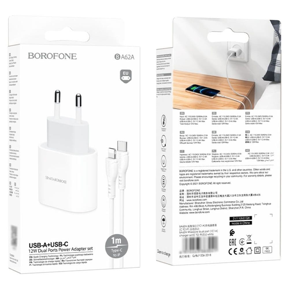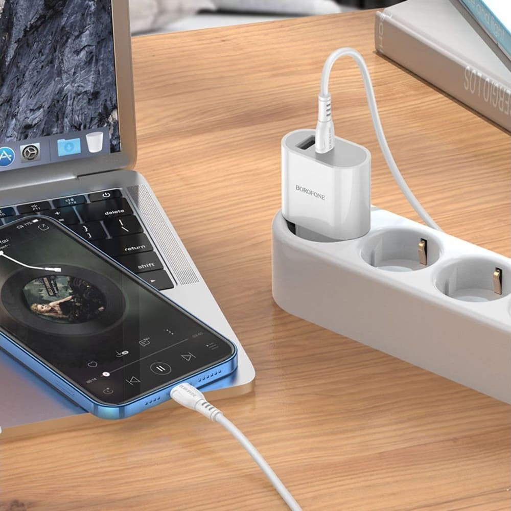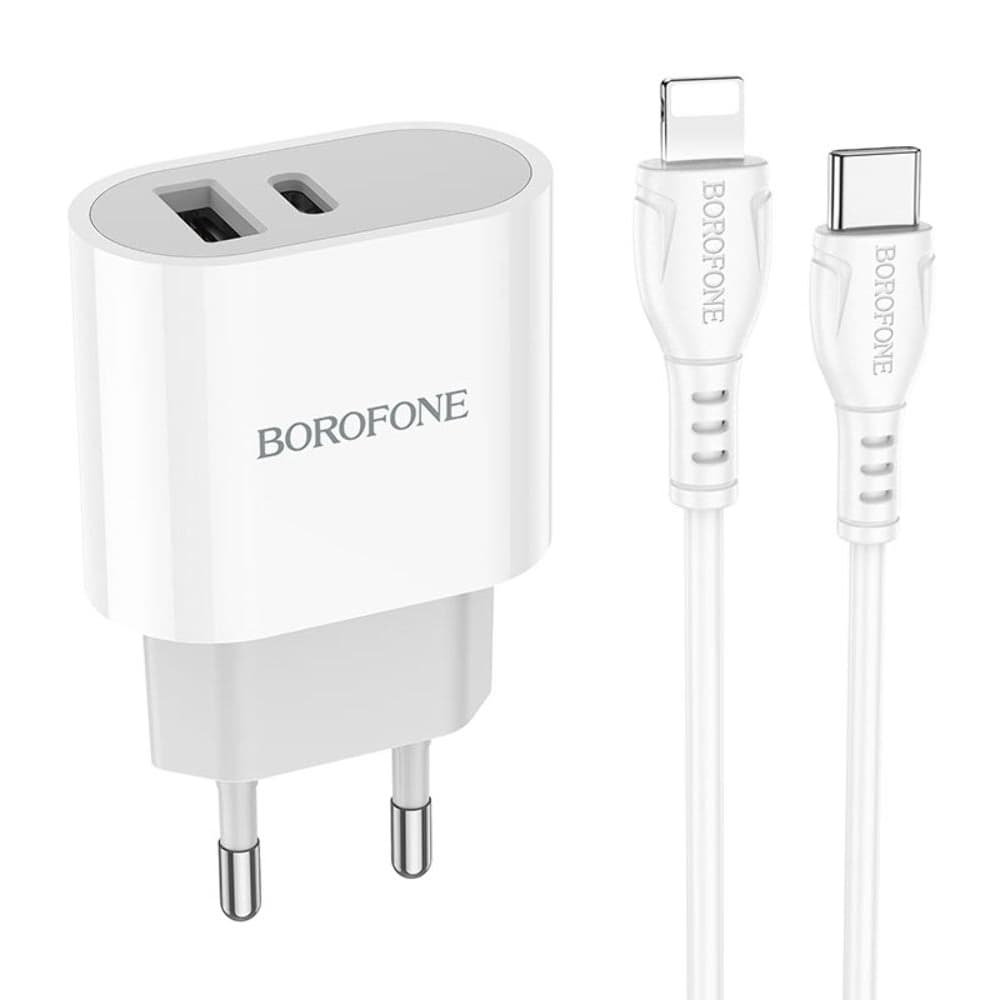 Сетевое зарядное устройство Borofone BA62A, 1 USB, 1 Power Delivery, с кабелем Type-C на Lightning, белое