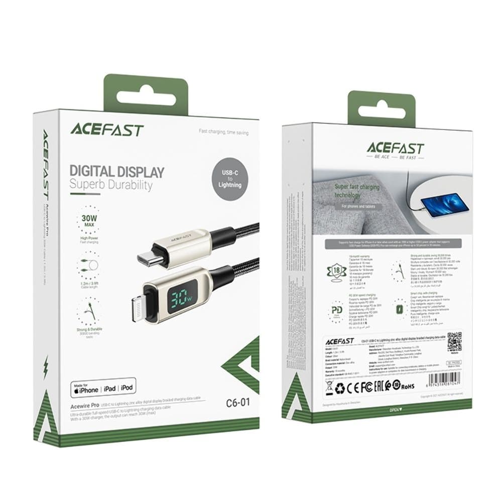 USB-кабель Acefast C6-01, Type-C на Lightning, Power Delivery (30 Вт), 120 см, с дисплеем, серебристый