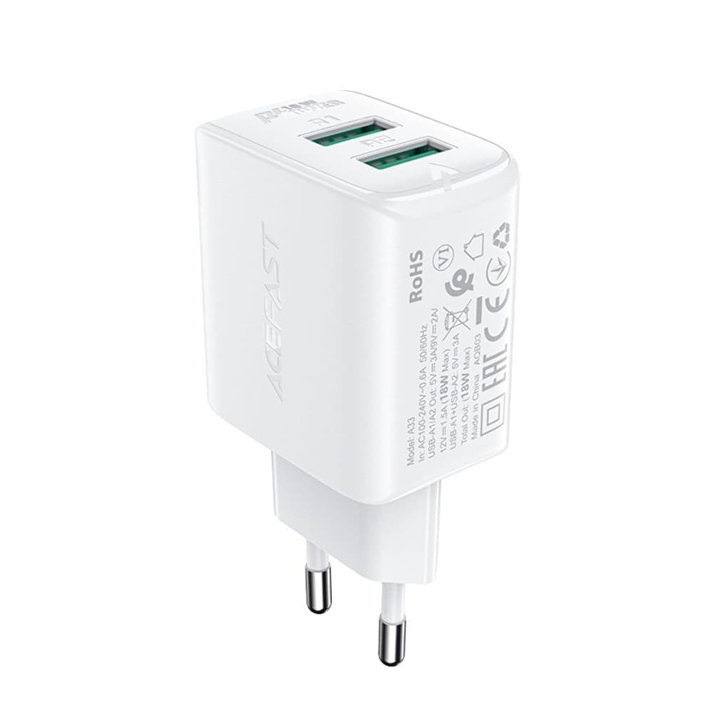 Купить Сетевое зарядное устройство Acefast A33, 2 USB, 3.0 А, 18 Вт, Quick Charge, белое можно и в нашем офисе, платить за доставку при этом не нужно.