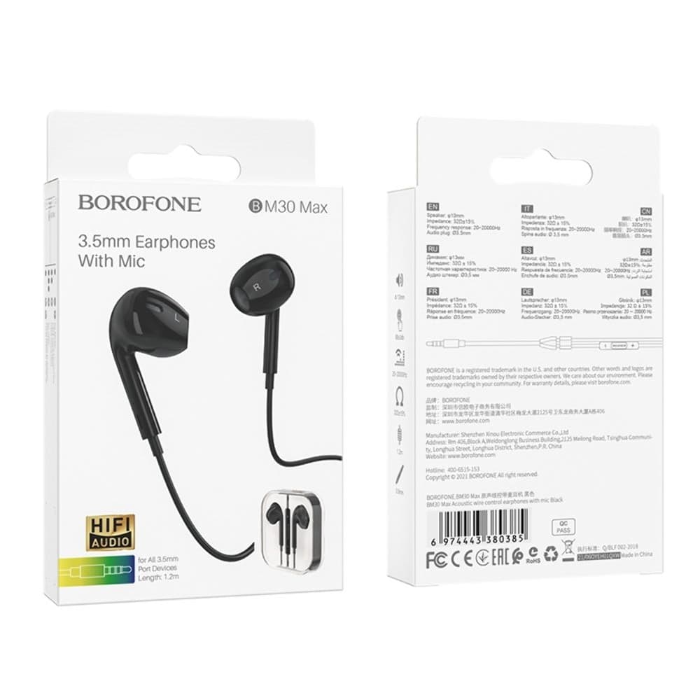 Купить Наушники Borofone BM30 Max, вкладыши, с микрофоном, Jack 3.5, черные можно и в нашем офисе, платить за доставку при этом не нужно.