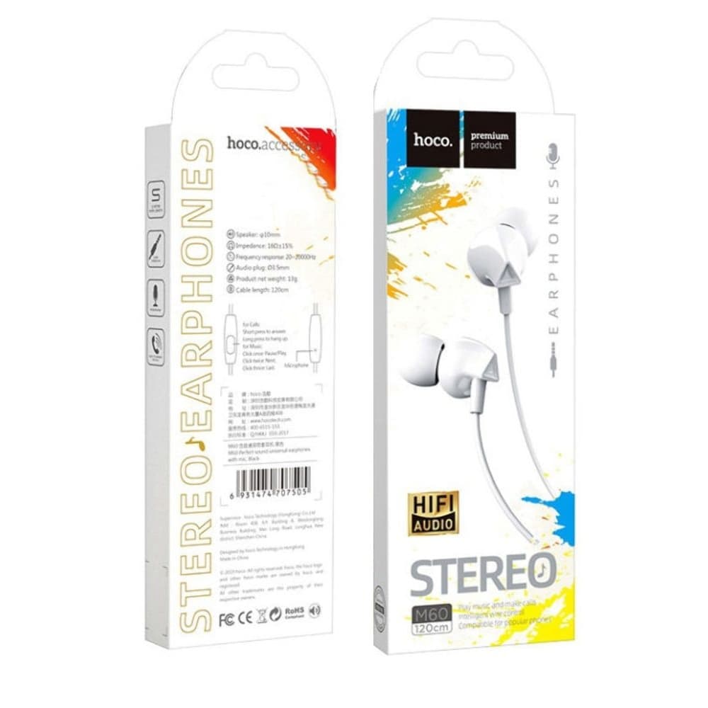Наушники Hoco M60, проводные, вакуумные, с микрофоном, Jack 3.5, белые