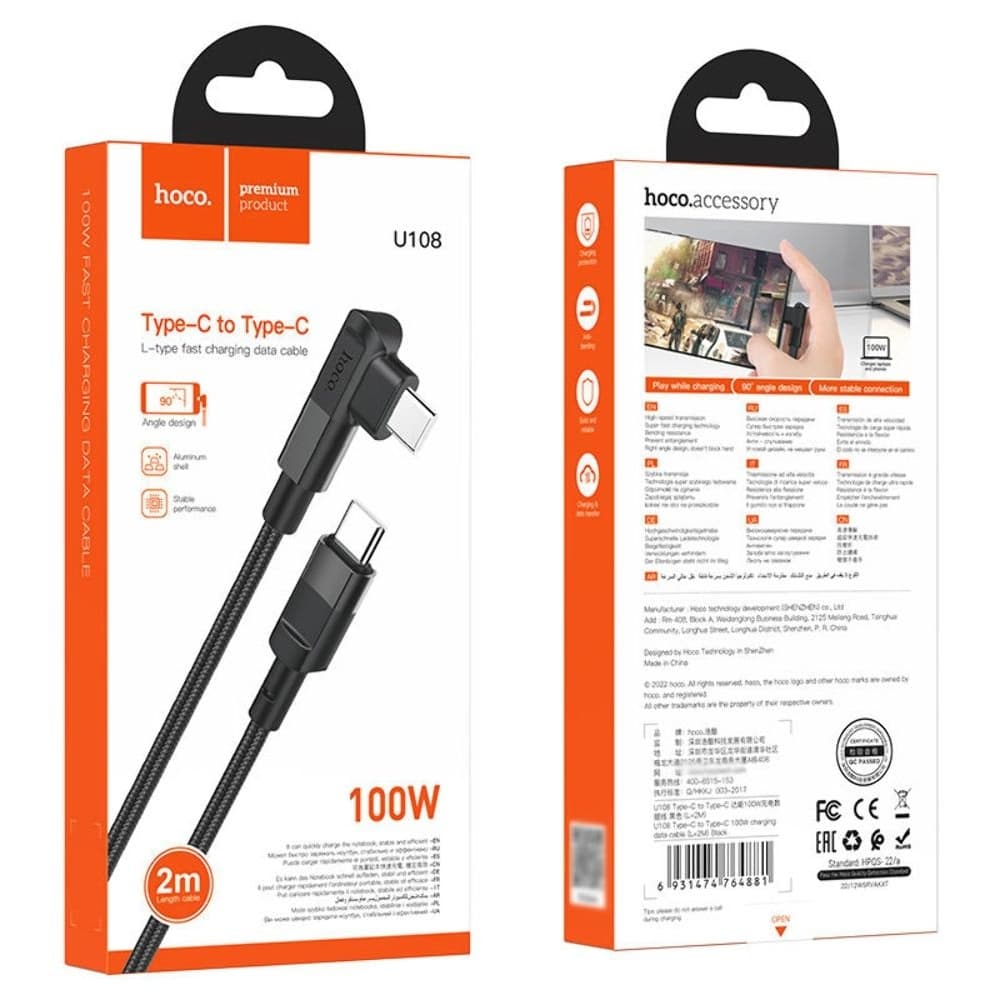 USB-кабель Hoco U108, Type-C на Type-C, Power Delivery (100 Вт), 200 см, Г-образный, чорний