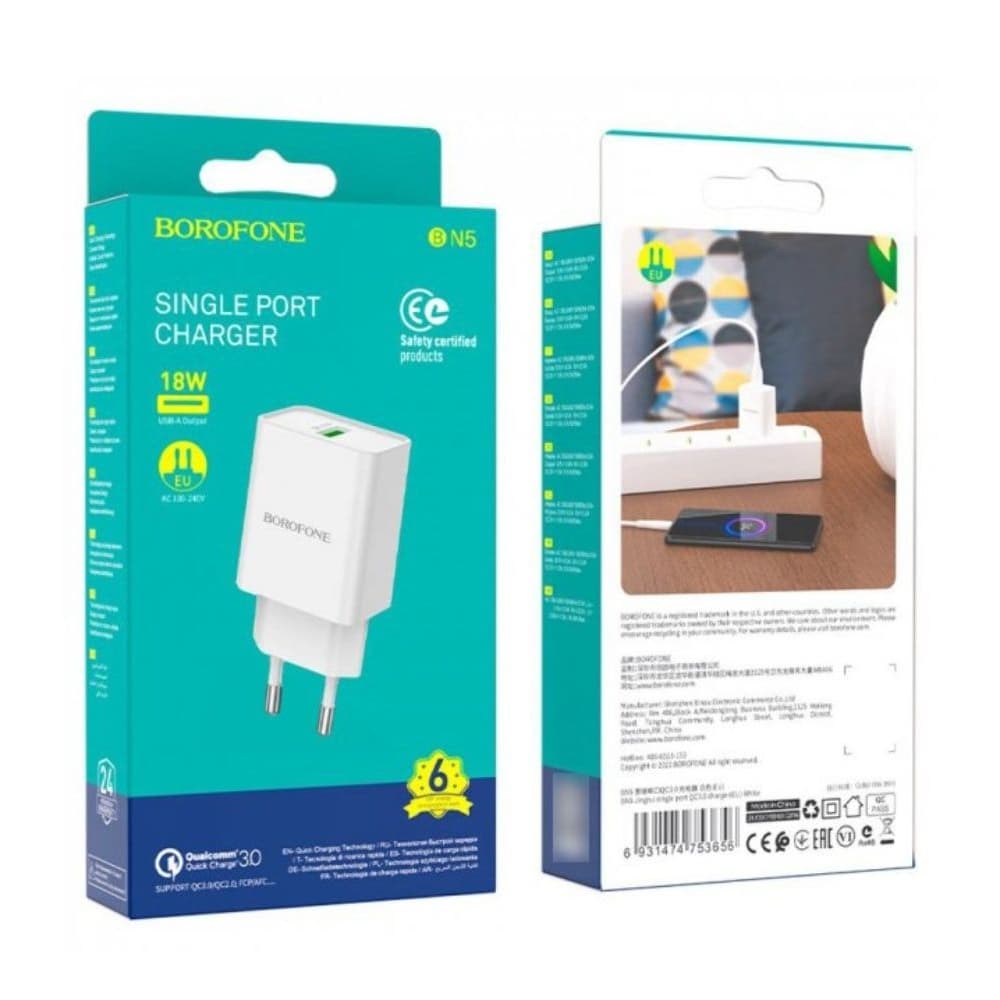 Сетевое зарядное устройство Borofone BN5, 1 USB, Quick Charge 3.0, 18 Вт, белое