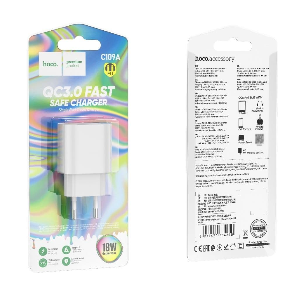 Сетевое зарядное устройство Hoco C109A, 1 USB, Quick Charge 3.0, 18 Вт, без кабеля, белое