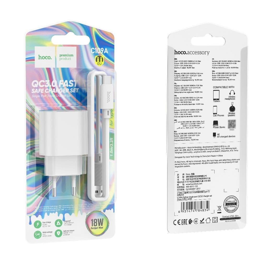 Сетевое зарядное устройство Hoco C109A, 1 USB, Quick Charge 3.0, 18 Вт, с кабелем Type-C, белое