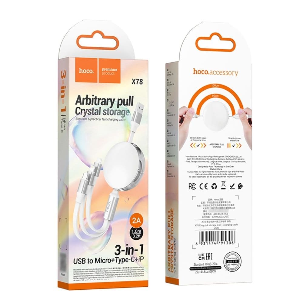 USB-кабель Hoco X78, 3 в 1, USB на Type-C/ Lightning/ MicroUSB, 100 см, білий