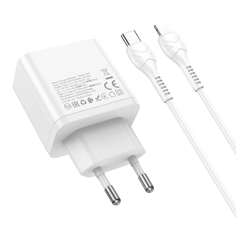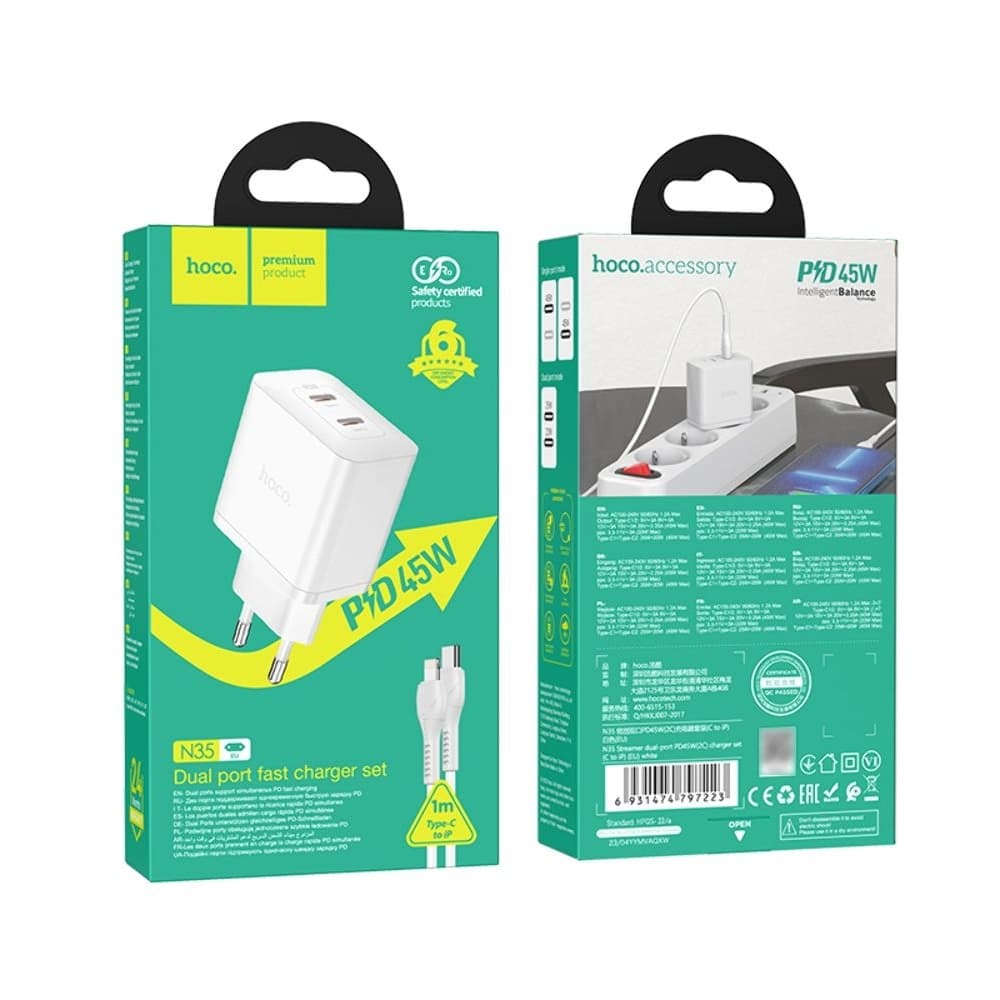 Купить Сетевое зарядное устройство Hoco N35, 2 USB Type-C, Power Delivery (45 Вт), белое, с кабелем Type-C на Lightning можно и в нашем офисе, платить за доставку при этом не нужно.