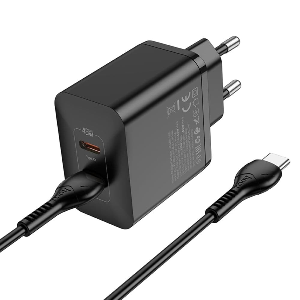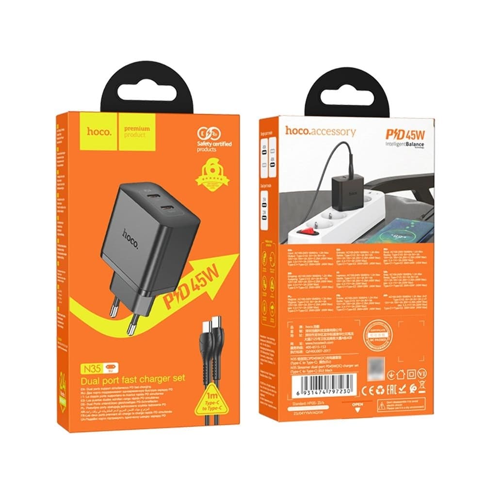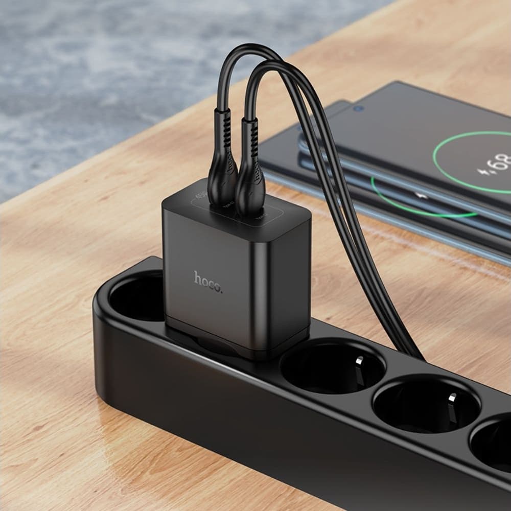 Купить Сетевое зарядное устройство Hoco N35, 2 USB Type-C, Power Delivery (45 Вт), черное, с кабелем Type-C на Type-C можно и в нашем офисе, платить за доставку при этом не нужно.